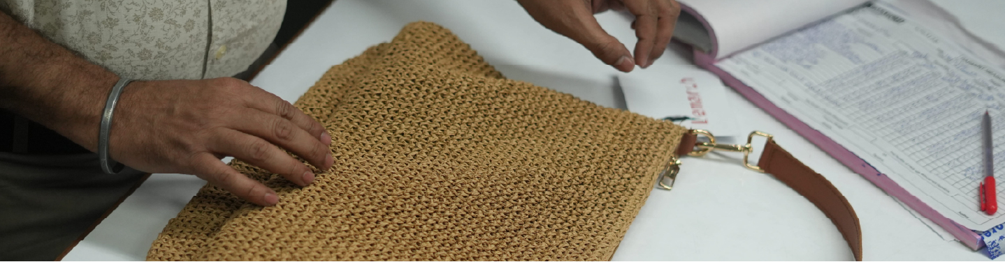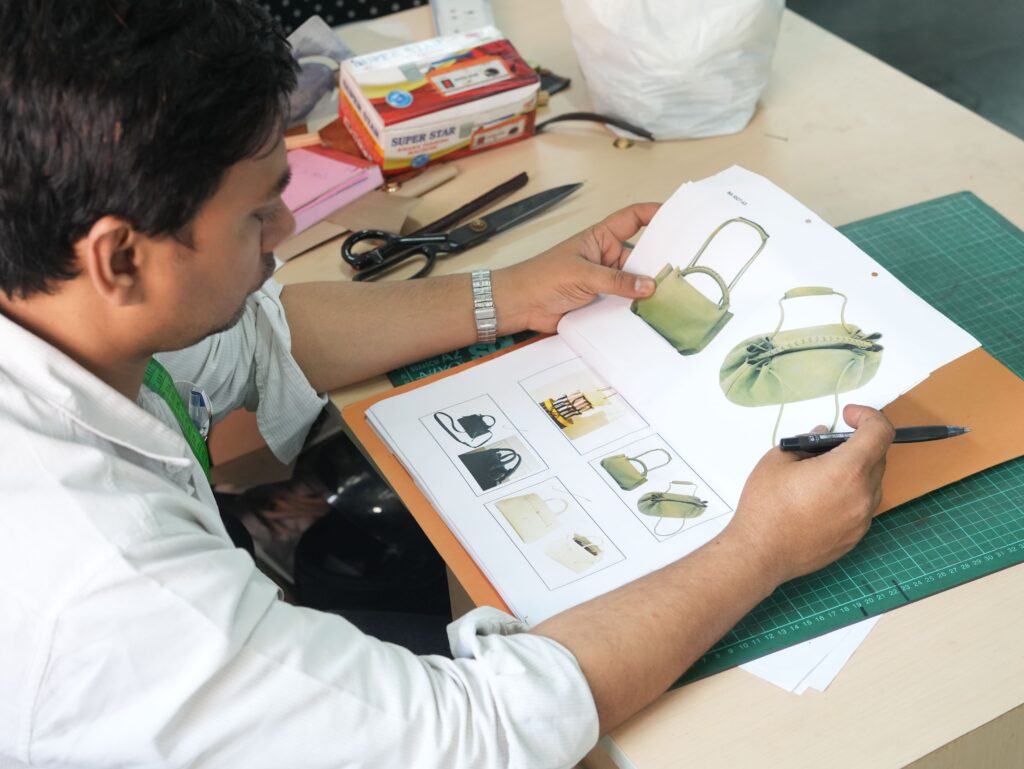 Pattern master reviewing handbag samples to assess construction, proportions, and detailing for accurate pattern development and production readiness.