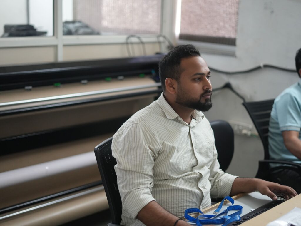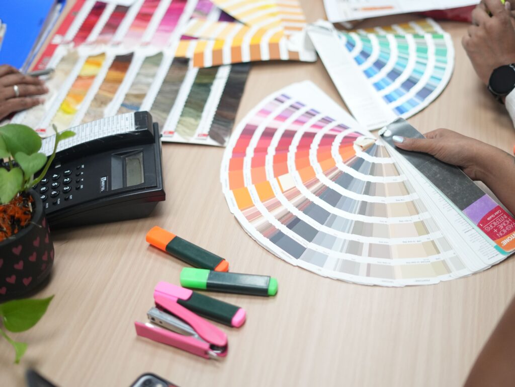 Team reviewing color swatches and material options to finalize shades and combinations as per client specifications.