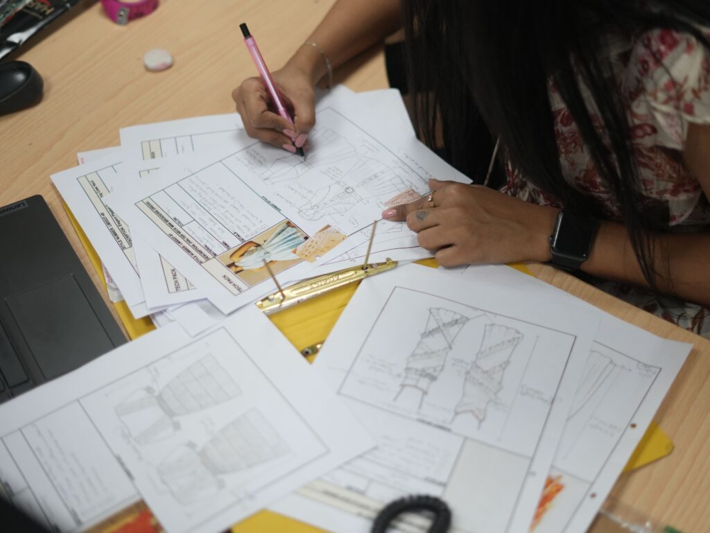 Design team preparing technical sketches and specifications, defining construction details and measurements for sampling and production.