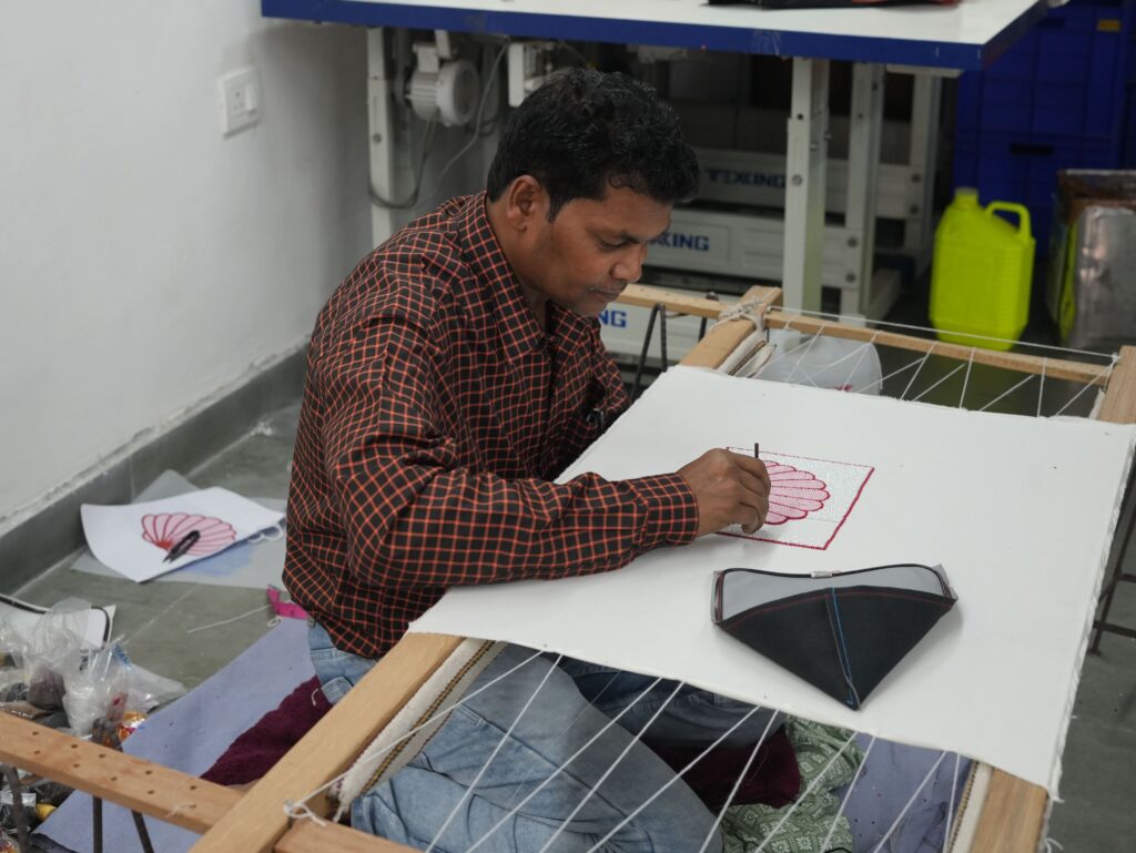 Artisan executing embroidery work on fabric, ensuring precision in design placement, stitch quality, and consistency for sampling and production.